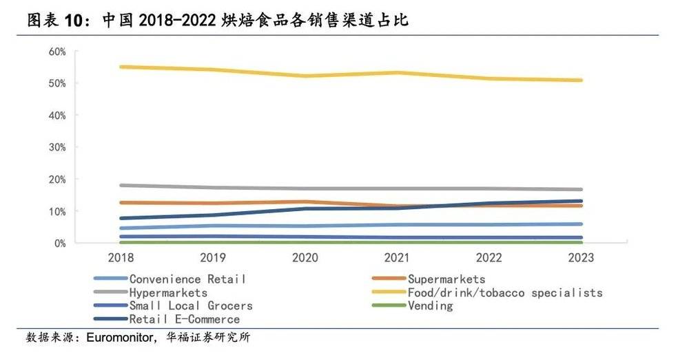近年来我国烘焙门店在烘焙食品渠道的占比下降。根据欧睿国际数据,中国烘焙食品在Food/drink/tabaccospecialists(食品/饮料/烟草专卖店)这一零售渠道的销售额占比,从2018年的55%下降至2022年的51.3%。[3]